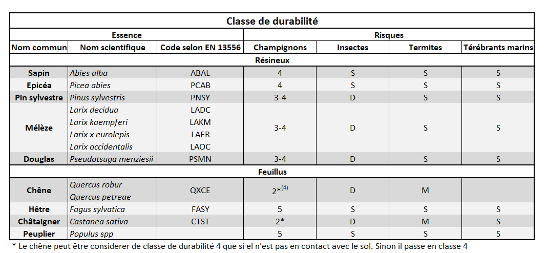 *Le chêne peut être considéré en classe de durabilité 2, sauf s'il est en contact avec le sol. Dans ce cas, la classe de durabilité 4 doit être considérée.