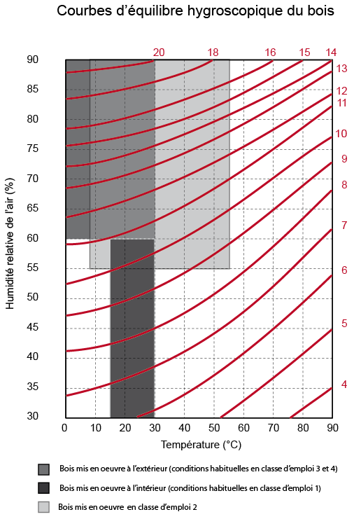 Les courbes présentées ci-dessous donnent une approximation de la teneur en humidité d’équilibre d’une pièce de bois massif en fonction des conditions d’ambiance dans lesquelles elle est placée.