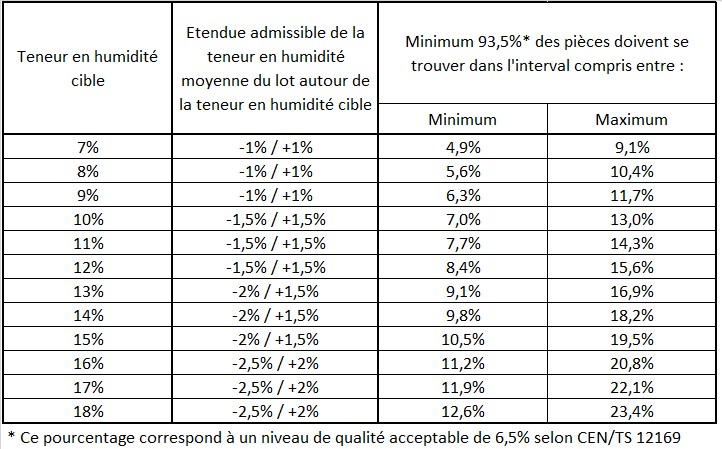 Le tableau ci-dessous permet de déterminer la teneur en humidité cible à prescrire pour certains éléments dans leurs conditions habituelles d’utilisation.