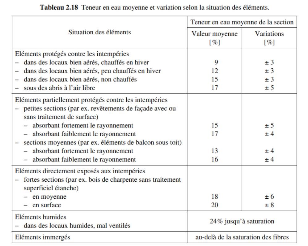 Le tableau suivant, provenant du volume 13 du traité de génie civil de l’école polytechnique fédérale de Lausanne, traitant de la construction bois permet d’estimer l’amplitude des variations de la teneur en humidité que les éléments subissent durant leur durée de vie.
