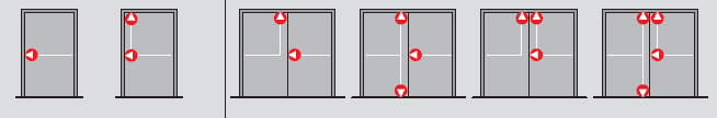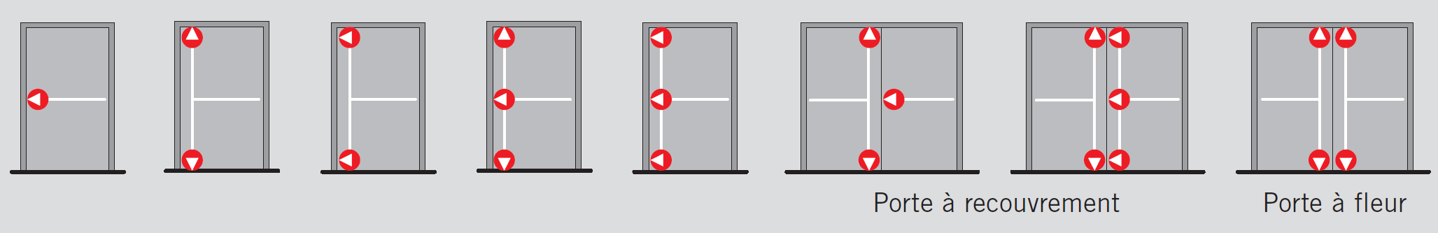 3 points de verrouillage (central, haut et bas), orientés horizontalement pour le central, horizontalement / verticalement aux extrémités.